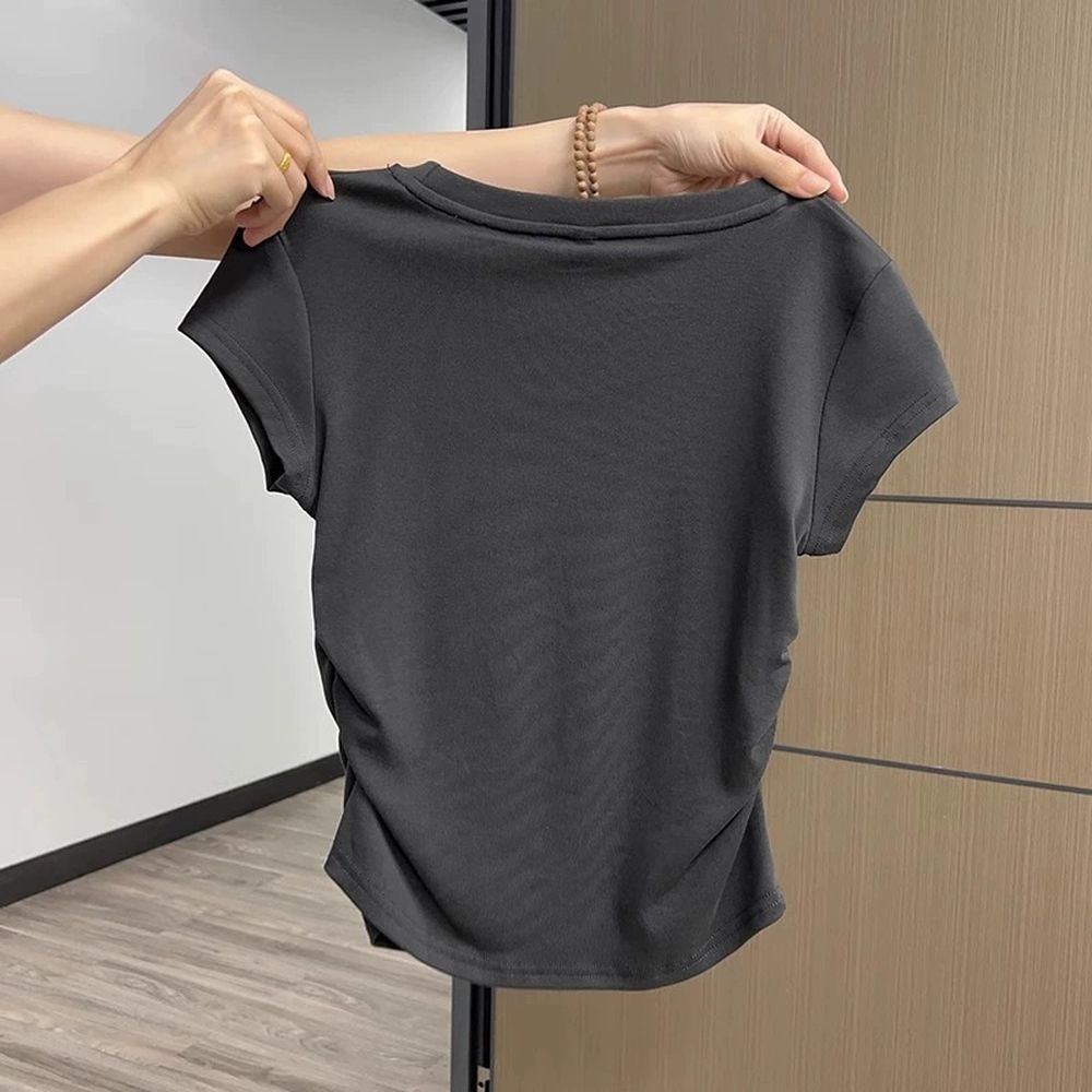 Women's Straight Shoulder Short Sleeve T-Shirt With Pleated Slim Fit Top